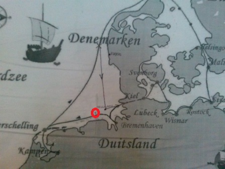 Soms speelt het toeval je leuke dingen toe, zoals vandaag. Het is een winderige dag met regenbuien en het is koud, 16 graden. We blijven binnen en lezen veel. Maar op een raam van de kantine van de jachtclub, waar we dankbaar voor afgemeerd liggen, zagen we van de week een aankondiging van een lezing voor vanmiddag over de Kamper Kogge. Een lezing over de 2e Ommelandtocht die de replica van het 14e eeuwse zeilschip in de zomer van 2016 maakte. Met een Ommelandtocht bedoelen ze een tocht om het Deense Jutland heen, zoals de oude handelsschepen van de het Hanzeverbond die vroeger maakten (zie de kaart hieronder) naar en van de Oostzee. Het Noordoostzeekanaal (het Kielerkanaal) was er toen uiteraard niet en door de Limfjord kon je toen niet varen, dus de koggeschepen moesten door de beruchte Jammerbocht en helemaal om de punt van Skagen heen.