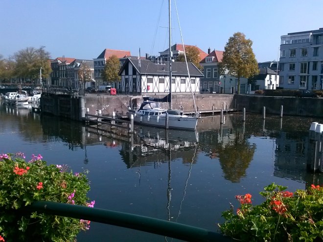 Vandaag een overwegend grijze dag. Op de sluis werken mannen verder aan het onderhoud. De hekken worden schoongamaakt en geverfd. De sluis is dicht, er staat een steiger in. We hadden hier deze week met onze boot dus helemaal niet door gekund. Onder buurtbewoners is opwinding. De gemeente wil onder aanvoering van onze Groen Linkswethouder zonnepanelen plaatsen op gemeentelijke gebouwen. Dus ook op het voorzieningengebouw voor passanten. Het van vakwerk voorziene witte gebouwtje was ooit de sluiswachterswoning. Zonnepanelen misstaan daarop, vinden sommigen. Het doet afbreuk aan het stadsgezicht. Voor mijn gevoel is dat overdreven.