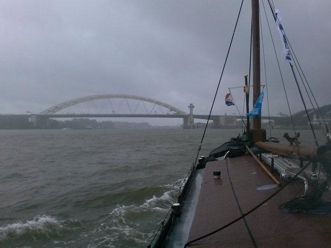 Vlagende regenbuien treffen het schip, maar op het tij schieten we goed op. Wat een gemak dat je op het traject geen brugopeningen nodig hebt! Na twee uren varen naderen we de Brienenoordbrug (foto hierboven). Goed drie kwartier later passeren we door de geopende Nieuwe Leuvehavenbrug, vlak voor de sierlijke Erasmusbrug, en varen de Museumhaven binnen. Achter de drijvende bootjesbrug is de kade waar de boten van het konvooi zich verzamelen (foto hier). Zondag zullen ze vertrekken.