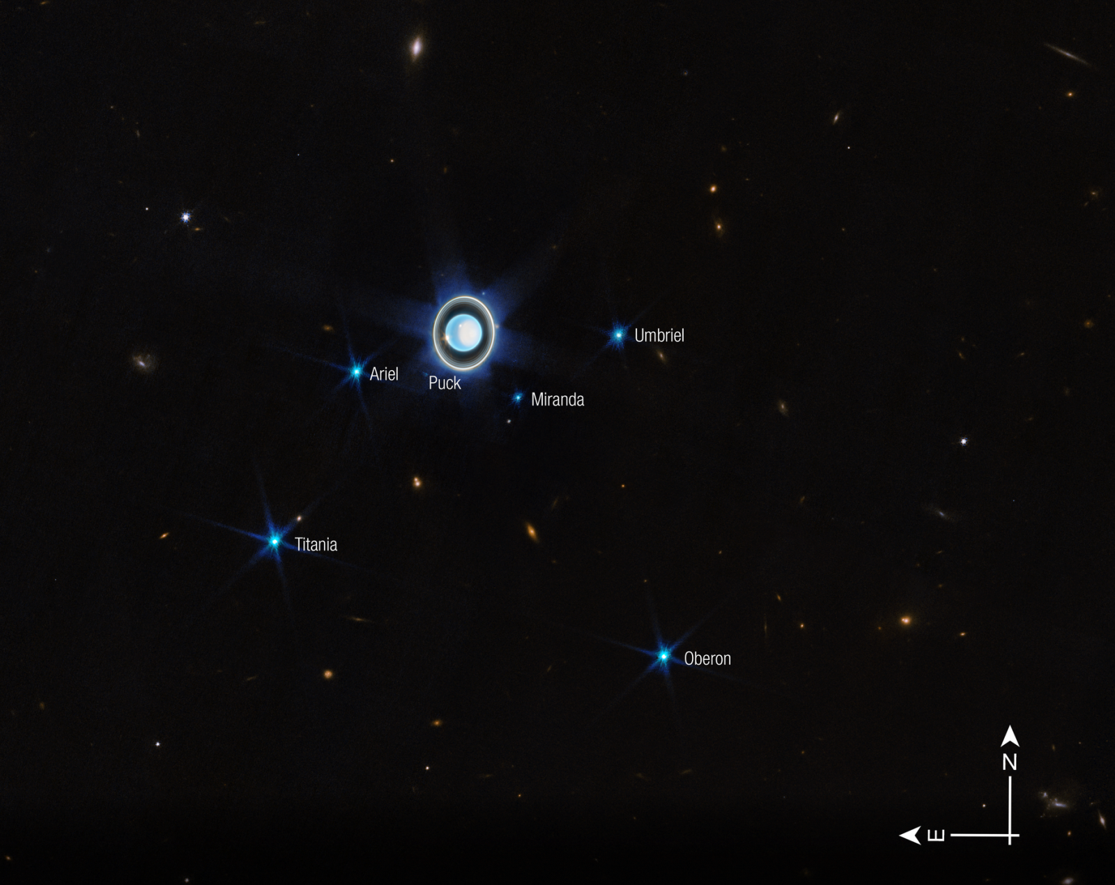Een aantal van de 27 manen van Uranus (Opname James Webb ruimtelescoop)