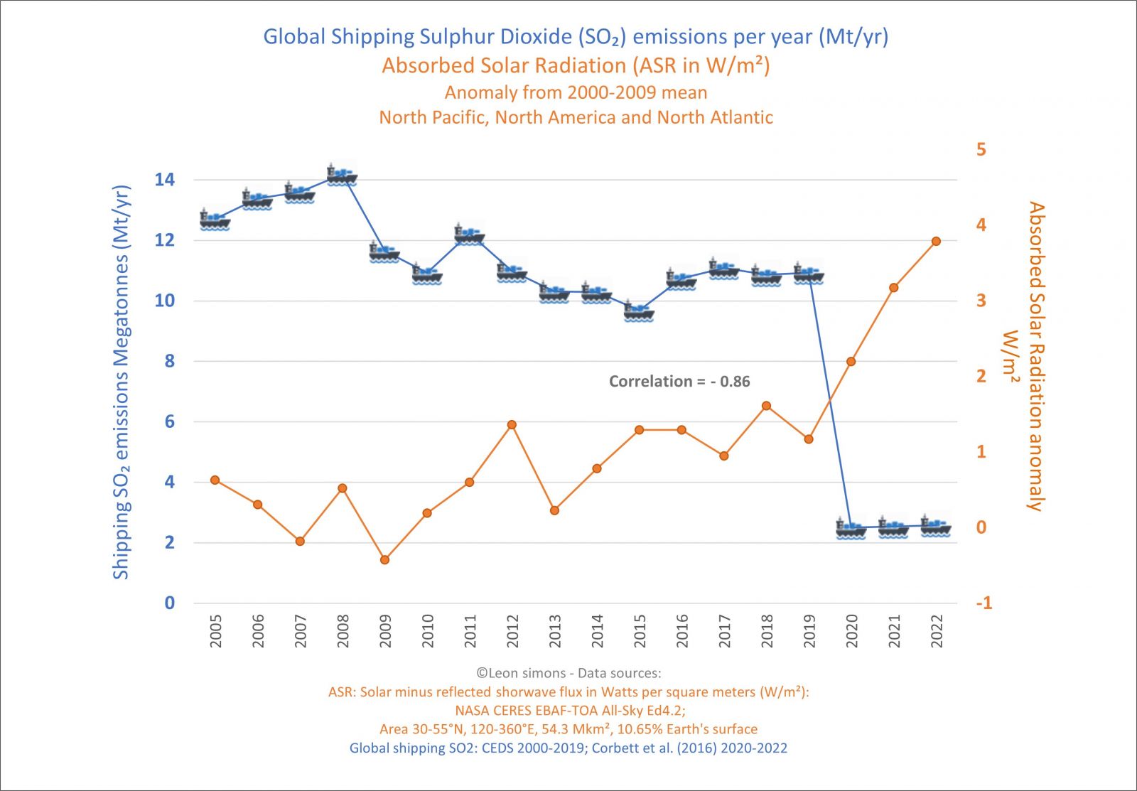 Toch is er een hypothese die de versnelde opwarming van die ontzaglijke bak water kan verklaren en dat is het verdwijnen van zwaveldioxide (SO2) uit de atmosfeer boven de scheepvaartroutes door het verstoken van schonere brandstof. Een maatregel, bedoeld om luchtverontreiniging tegen te gaan, maar die dus - navrant genoeg - méér opwarming van de oceanen veroorzaakt. Ironie is nooit veraf, ik meldde het eind vorige maand al in een uitvoerig bericht. De media schreven er nauwelijks over, maar nu brengt de Los Angeles Times het nieuws groot: 'By cleaning up shipping fuels, massive regions of the world’s oceans that were protected from heating by shipping sulfate aerosols are now experiencing rapid warming'. NB: het is nog een hypothese, die bewezen moet worden! Bovendien gaat het allemaal ook nog gepaard met een alsmaar sterker wordende zonnecyclus - de 25e - die de komende jaren extra hitte naar de aarde voert. NB: in 1982 - 1983 was er geen actieve zonnecyclus.