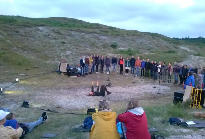 Oerol dag 8. We fietsen na het avondeten naar het Arjensdune, ergens aan de rand van duin en weiland tussen West en Midsland. De kille westenwind hebben we mee. We zijn op tijd; bij het overvolle Eetcafé 'De Kooi' stappen we af voor koffie. Dan is het wachten tot half negen met naar schatting een honderd mensen, die her en der in het duin zitten. Opeens start de voorstelling: een lange magere man komt onopvallend aanlopen en begint te praten en te spelen (foto hier). Het is acteur Vincent van der Valk van Theater Utrecht en de voorstelling heet 'Immens', 'een muzikale, filosofische en humoristische voorstelling, geïnspireerd op het gedachtengoed van Friedrich Nietzsche: de filosoof met de hamer.' De acteur noemt zichzelf Frits. Verderop in een duinpan bouwt hij de voorstelling uit tot een verrukkelijk en overdonderend spektakel, vol filosofische cirkelredeneringen. Om dat te onderstrepen rent hij tot uitputtens toe in kringen rond. Alles komt langs: religie, wetenschap, het cogito, de vrije wil en het post-modernisme. En Nietzsche's alter ego Frits rent maar rondjes, niet zonder humor. Op zeker moment zegt hij zin te hebben in een ruime bocht; hij klautert het duin op en verdwijnt rennend achter het publiek om even later aan de andere kant terug te keren. Al die filosofische hersenspinsels zet Frits in hoog tempo uiteen, soms is het te snel om te volgen. Frits moet er in elk geval niets van hebben. Niets is immers wáár in het onverschillige universum, alles is door de mens verzonnen, het zijn slechts bouwsels van de geest. Doe er niet aan mee, is de boodschap, blijf jezelf - al is dat ook maar een constructie van jezelf. Breek eruit! Mooi gezegd, maar waarheen? Juist op dat moment vliegt hoog over het duin een grote vogel langs en de acteur incorporeert het toeval handig en wijst hem na.