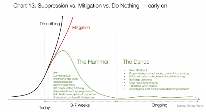 Deskundigen beweren echter steeds duidelijker dat het nog minstens een jaar zal moeten duren, zo niet langer. Het opheffen van maatregelen, bijvoorbeeld om de benarde economie wat lucht te geven, zullen naar alle waarschijnlijkheid een opleving van de epidemie veroorzaken, waarna het regime opnieuw strenger moet worden. Enzovoorts. Men noemt het 'de lichtknopmethode' en ook wel de strategie van 'pompend remmen' (hieronder):