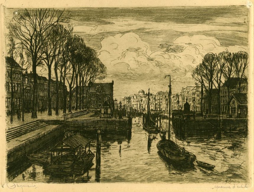 Honderd jaar is voor de lange geschiedenis van deze plek niet veel. Zalmvissers werden door bootjesmensen vervangen, op de rivier vist men niet meer; wel zijn er in het weekeinde viswedstrijden op de steigers. Die gooien hun vangst terug. Je zou er een betekenis in willen zien, maar die is er niet. Wat me wel verwonderd is dat de bomen zo hoog zijn; in feite net zo hoog als nu. Ooit gerooid, vervangen en weer groot gegroeid, neem ik aan. De signering van de tekenaar is slecht leesbaar. Het is - denk ik - Waalko Jans Dingemans (1873 - 1925), die vanaf 1911 in Gorcum woonde en er belastingontvanger en lid van de gemeenteraad was. De tekenaar heeft de prent donker gehouden, haast alsof het een houtsnede is. Er hangt een aangename melancholie. Het zal de komende maanden ook weer ons uitzicht zijn; vanwege de voortdurende corona-pandemie zullen we we niet veel anders zien. Ach, het uitzicht kon beroerder.